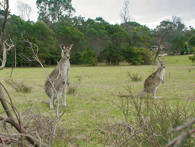 Im Nachbardorf hüpfen die Kängurus auf der Straße rum, und stören sich nicht an den vorbeifahrenden Autos. Sind nicht scheu, und sehen so was von lustig aus, wenn sie loshoppeln :) Außerdem hat Pambula einen netten Strand, an dem doch tatsächlich noch Leute baden gehen. Es ist eigentlich ganz prima Wetter. Solange die Sonne scheint, schwitzt man wie im Hochsommer, sowie sie weg ist, ist Herbst, kalter Herbst. Sehr gewöhnungsbedürftig.