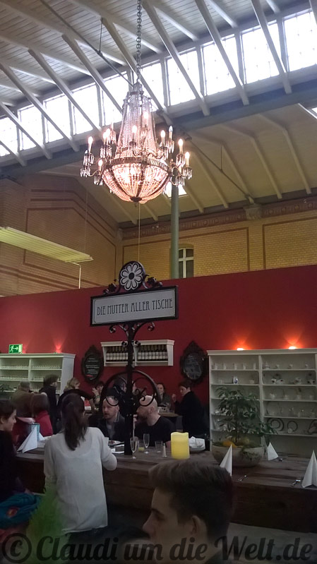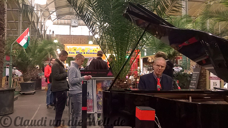 Die Arminiusmarkthalle ist nicht außergewöhnlich groß, auch kein Jugendstilbau wie in Budapest, aber der rote Klinkerbau hat auf seinen wenigen Quadratmetern ein paar auffallend hübsche Ecken zum Brunchen. Nix Bierzeltgarnitur! Hier wird an einem massiven Holztisch (der „Mutter aller Tische“) unterm Kronleuchter bis in den frühen Nachmittag hinein Kürbissüppchen und Kaffee genippt, Stoffservietten inklusive. Die Gourmetecke des Hofladens ist nicht zu verfehlen, Kübelpalmen weisen den Weg. Man kann auch der Pianomusik folgen. Zwischen Äpfeln und Eiern steht da ernsthaft ein Modell Boston und wird virtuos von einem Hamburger Herrn bedient. Gegenüber darf Wein gekauft und verkostet werden… da kann man den Vormittag verbringen.