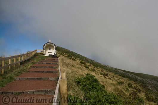 Den Weg zum Cabeço Gordo, dem höchsten (1043 m) Berg und selbstverständlich auch Vulkan Faials haben wir des schlechten Wetters wegen gleich zweimal angetreten. Es wurde nicht besser, entsprechend müde und farblos sahen die meterhohen, sonst blau blühenden Hortensienhecken und –hänge aus. Sie sind der Grund für den Beinamen Faials als die Ilha Azul (blaue Insel). Wenn man richtig viele und lange Hortensienhecken auf den Azoren sehen möchte, muss man Faial besuchen – im Sommer.