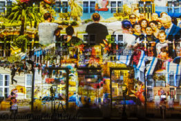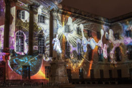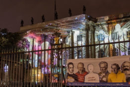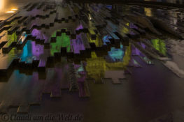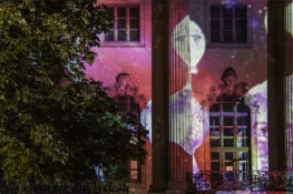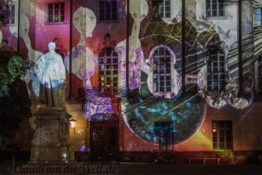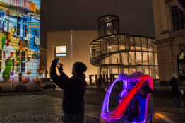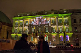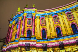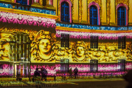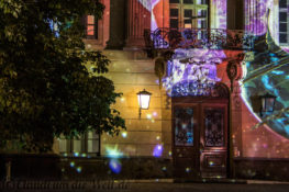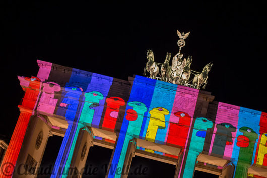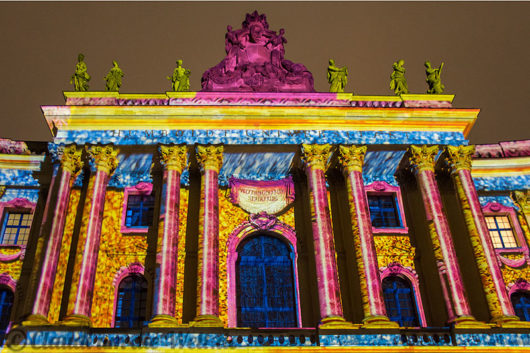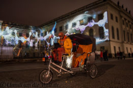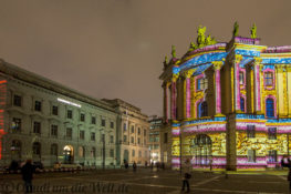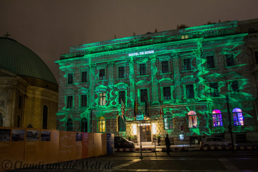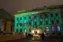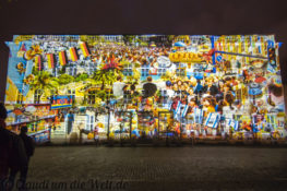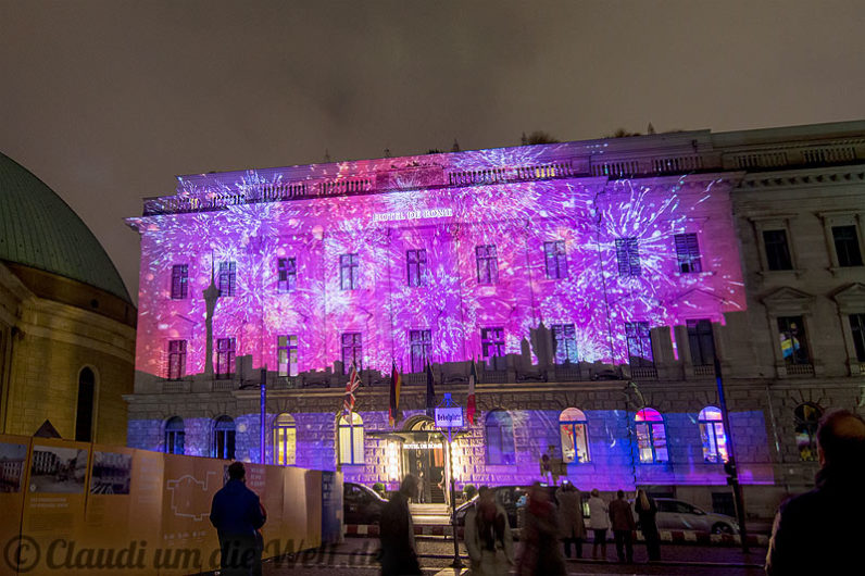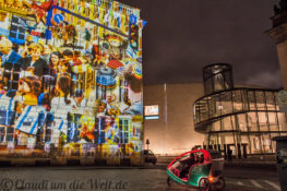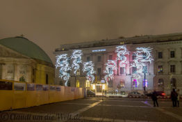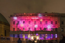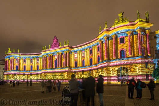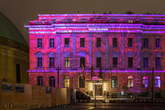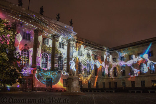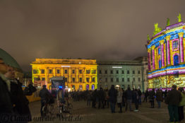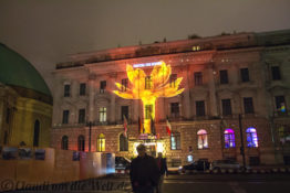 Am Brandenburger Tor liefen 5 Videos über die Torfassade, allesamt Teilnehmer eines Videomapping-Wettbewerbs. Gute Idee und schöne Sachen dabei! Am Berliner Dom sahen wir wie immer Folien auf der Fassade, die Comic-Motive gefielen mir am Besten. Am Palais am Festungsgraben zu fotografieren, ist etwas tricky. Nicht ohne Weitwinkel, und selbst der reichte nicht aus, so nah steht man vor der deutsch-israelischen Freundschaft und Frau Merkels Bad in der Menge. Das Hauptgebäude der Humboldt Uni hat es dieses Mal astrowissenschaftlich genommen. Hat mir gefallen! Die juristische Fakultät auf der anderen Straßenseite hatte sich 2015 auch auf nur eine Folien beschränkt, in Gelb, Pink, Weiß und Blau. Und irgendwie erinnerte es mich an eine der Folien vom letzten Jahr. Egal, bunt und quietschig geht immer!