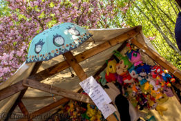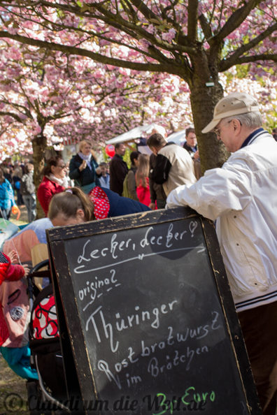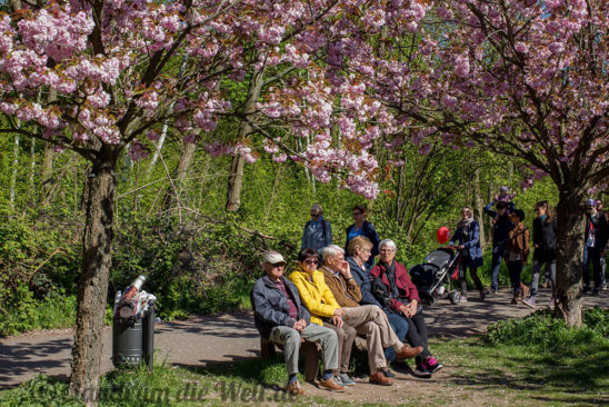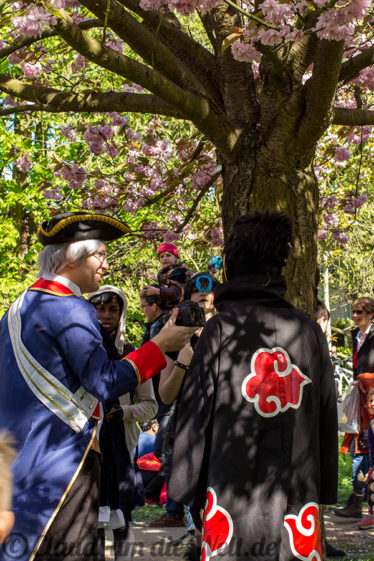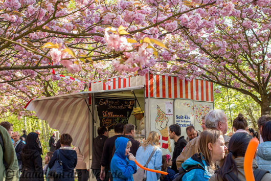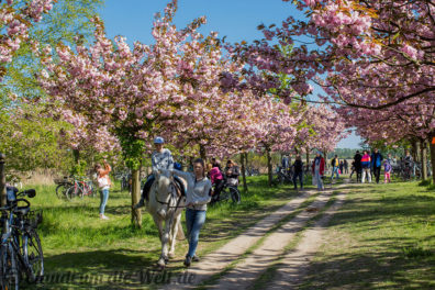 Und auch in Berlin wird unter den Kirschbäumen die Sakura gefeiert – mit Picknick und Familie. Oder im Cosplay-Kostüm als Animé-Katze mit türkiser Haarpracht und was den Kids da nicht alles einfällt. Nein, niemand kam als Pikachu! Im Süden von Lichterfelde, man nennt das hier schon Teltow, blühen mehrere Kilometer Kirschbäume in spazierfreudiger Alleeform. Das Kirschblütenfest (japanisch Hanami) fand nur heute statt, inklusive Bratwurst, Waffeln, Ponyreiten und völlig deplatzierten Parteiwerbeständen. Die Kirschblüten sind noch ein bisschen länger da, und jederzeit begehbar. Die ersten Blüten wehen aber bereits als zarter Schneeschauer durch die Berliner Luft… also beeilen oder für nächstes Jahr vormerken, am 30.4. ist Hanami in Berlin.