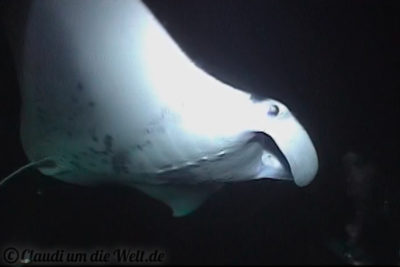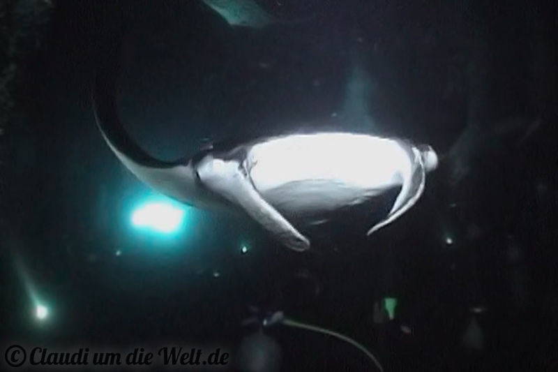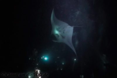 Da sitzen bzw. liegen wir also in 12 Metern Tiefe am Meeresboden. Was hinter uns im Dunkeln passiert, blenden wir aus. 45 Minuten lang ist unser Job, die Lampe aufrecht zu halten und die Mantas zu füttern, die nach und nach aus dem Dunkel eintrudeln.