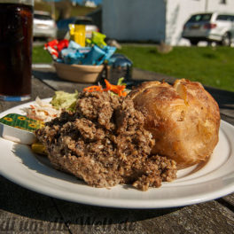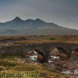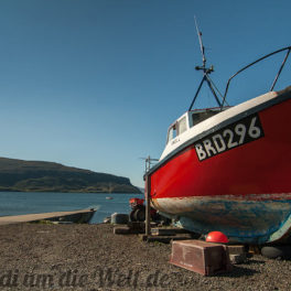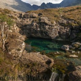 So reist die Weltenbummlerin weiter zum Ort Stein an der Loch Bay von Waternish. Bei einem zünftigen Haggis im ältesten Inn im ganzen Inselreich beschaut sie die Boote im kleinen Hafen und die wenigen, aber makellos weißen Häuser des Dorfes. Ein bisschen himmlisch ist all das durchaus, denkt sie sich. Doch sie muss das genau wissen und so hüpft sie wieder in ihr Gefährt und steuert frohen Mutes erst gen Süden, dann gen Osten und erneut gen Süden bis sie an einem Wegweiser gelangt, der den Weg zu den Fairy Pools weist.