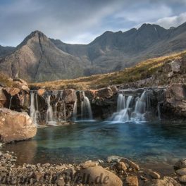 Für einen Augenblick wird die Fee ernst und schaut in das rote Gesicht der Weltenbummlerin. Dann bricht sie erneut in Lachen aus und fällt von der Brücke. Sie bemerkt, dass das Mädchen über die Antwort gar nicht erfreut ist. Sie schwebt ihr entgegen: „Was willst du mit einer Flagge?“ „Die Fee im Dunvegan Castle sagte, wer die Flagge hat, hat den Himmel auf Erden.“ „Den Himmel auf Erden? Den suchst du?“ „Ja, er soll auf Skye sein.“ Wieder kichert die Fee verschmitzt. „Den Himmel findest du nicht mit einer Flagge. Du erkennst ihn, wenn du in den Pools schwimmst.“ „Pools?“ „Die Fairy Pools! Aber vorher stärke dich im Inn von Stein.“ Und mit einem Pling ist sie weg.