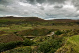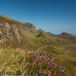 Ermutigt begab sich die Weltenbummlerin auf die Reise ins ferne Land der Isle of Skye. In Schottland, ganz im Westen, da, wo die Schotten noch die alte Sprache sprechen, da soll das Eiland zu finden sein. Mit einem großen Schiff fährt sie zwischen Inseln und Inselchen hinüber. Schon von Weitem erblickt sie in der blendenden Mittagssonne ein grünes Bollwerk an der Nordwestspitze der Insel, in die Landschaft gebettet wie ein schlafender Riese. Trotternish nennt er sein Bett, es nimmt eine ganze Halbinsel ein. Das grüne Bett gefällt dem Mädchen und so besteigt es sein Gefährt und tuckert am Bett des Riesen Quiraing entlang. Auf seiner grünen Haut lagert allerhand Geröll und Heidekraut und kleine Wälder sind darauf gewachsen. Eine friedliche Landschaft, in der der Riese ebenso friedlich schläft.
