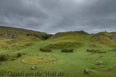Am nächsten Tag bricht die Weltenbummlerin erneut auf. Zum Abschied hatte ihr Miss Ocean eine Muschel geschenkt, sie würde sie noch gebrauchen können, hatte die Alte gemunkelt. Das Reisemädchen fährt gut gelaunt über die Isle of Skye: von Süd gen Nord, von West gen Ost, die Zacken des Cuillin immer im Blick, bis sie schließlich wieder am Bett des Riesen Quiraing ankommt. Die Furchen in seiner Bettdecke kommen ihr vor wie Wege. Sie biegt ab, wie von Miss Ocean beschrieben.