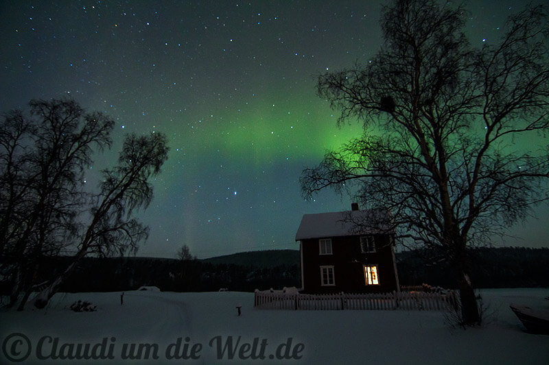 Ich falle ja nicht hart, aber die Kameraaaa! Die stürzt in den Pulverschnee! Panikattacke. Ich schnapp das Stativ, schüttle den Schnee ab und puste den Schnee weg. Ich renne ins Haus, im Windfang ist es kühl, da kann die Kamera langsam akklimatisieren. Noch mal schütteln. Noch mal pusten. Schmelzen dürfte der Schnee bei diesen Temperaturen ja nicht. Kondensat wäre wirklich nicht gut. Ruhig bleiben und in der Küche Gudbrandsdalsost essen. Nach einer Weile schalte ich die Kamera wieder ein. Sie lebt, Gott und allen Bäumen, Bergen und Hastenichtgesehen sei Dank! Ich bleibe trotzdem drinnen. Diese Anhoserei ist mir zu anstrengend. Die Nordlichter sehe ich vom Schlafzimmerfenster aus weiterziehen. Vermutlich werden sie um diese Uhrzeit noch intensiver, aber ich bin k.o. für heute.