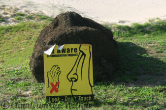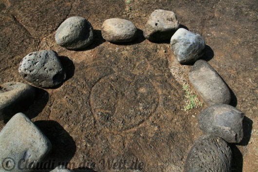 Wir navigieren die Küste entlang von der hübschen Tapati-Dame nach Süden zu diesem komischen Relief mit einer gekrümmten Figur. Das ist der Vogelmann. Er gehört zu einem Kult aus vergangenen Tagen, das Tapati ist eine Anlehnung an diesen Kult. Die Historie beschreibt es so: Nur wer den Lauf vom Vulkankrater des Rano Kau hinunter und eine Schwimmstrecke zu den vorgelagerten Felsbrocken Motu Nui und Motu Iti schaffte, von dort das Ei einer Rauchschwalbe holte und wieder zum Vulkan und dem Kultdorf Orongo brachte, konnte seinem Häuptling den Titel des Vogelmannes holen. Petroglyphen dieses Vogelmannes sieht man heute noch an einigen Steinen am Kraterrand des Rano Kau. Zum Vogelmann-Kult gehört auch die Maske, im Bild links neben dem Relief.