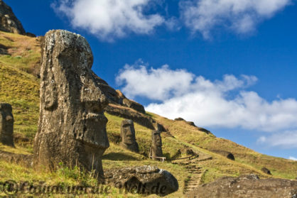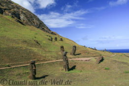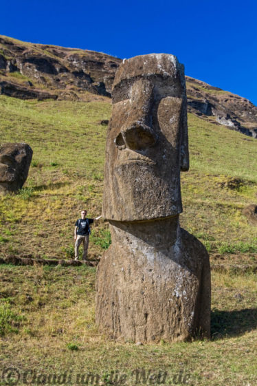 In und an diesem Vulkankrater liegen und stehen noch heute fast 400 Moai mehr oder weniger transportbereit, um zu ihren Standplätzen gebracht zu werden. Bei einer Begehung der Steinbrüche an den Hängen des Kraters konnte ich anhand der unfertigen Steinmänner sehen, wie sie aus dem Tuffstein gehauen, gedreht und aufgerichtet wurden. Exemplarischer kann Archäologie eigentlich nicht sein.