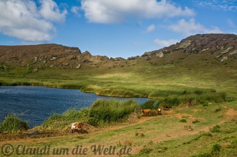 Mehrere Vulkane bilden die Osterinsel, der höchste davon ist Poike, auch sehr beliebt bei Wandersleuten. Rano Raraku und Rano Kau sammeln sogar Wasser in ihren Kratern. Die Pferde, die auf der Karte sogar zweimal auftauchen, sind tatsächlich überall anzutreffen. Sie laufen frei über die Insel, scheinen niemanden zu gehören und machen teilweise auch keinen sehr gut genährten Eindruck.