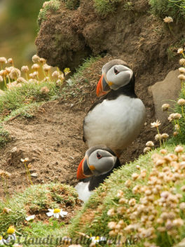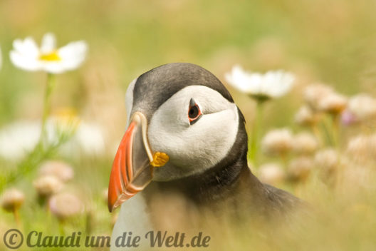 Auf erdigen Vorsprüngen haben sich die Papageientaucher ihre Baue gegraben und eingerichtet. Ihre Vorgärten sind mit wilden Blumen und Gras bewachsen, einige sind Zuhause. Dass Tammie Norries nicht so clever sind, wird ganz offensichtlich, als ich mich über die kleine Steinmauer lehne: sie gehen nicht weg. Im Gegenteil, sie werfen sich in Pose und machen den Offizier in weißem Laibchen und schwarzem Rock. Wir sonnen uns zusammen, ich und die ulkigen Vögel. Bis einer über die Klippe hopst… und wild zu flattern beginnt. Das sind also 40 Schläge die Minute und ich muss doch ein bisschen in die Kulisse kichern. Tollpatsche sind mir sympathisch.