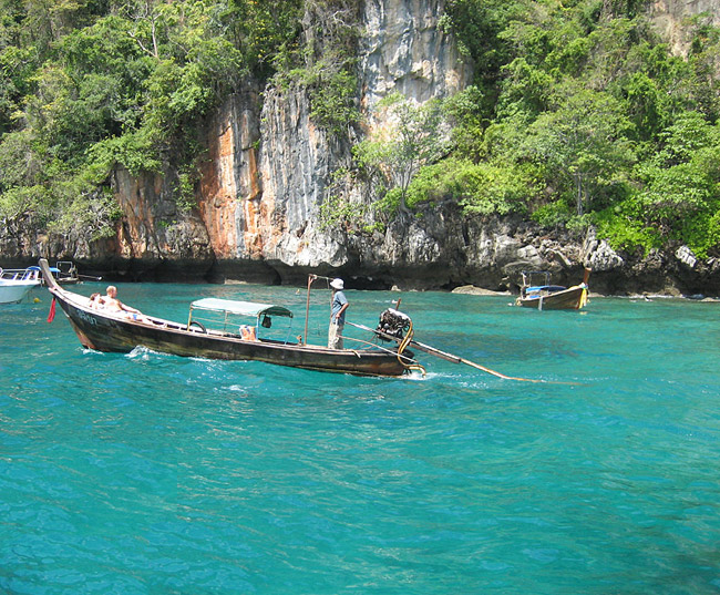 Apropos Strand. Erinnert sich jemand an diesen Meilenstein der Filmgeschichte mit DiCaprio – „The Beach“? ICH WAR DA! Also nicht im Kino oder so, sondern auf der Insel, wo der Film spielt. Genannt Koh Phi Phi (man sprich es wirklich wie Pi Pi). War ein Tagesausflug per Achterbahn, die sie als Speedboot deklariert hatten. Wir sind also fleißig über das Wasser gesprungen und die Wirbelsäule immer schön mit… ich denke, die wollten hinterher eine Menge Thai-Massagen verkaufen.